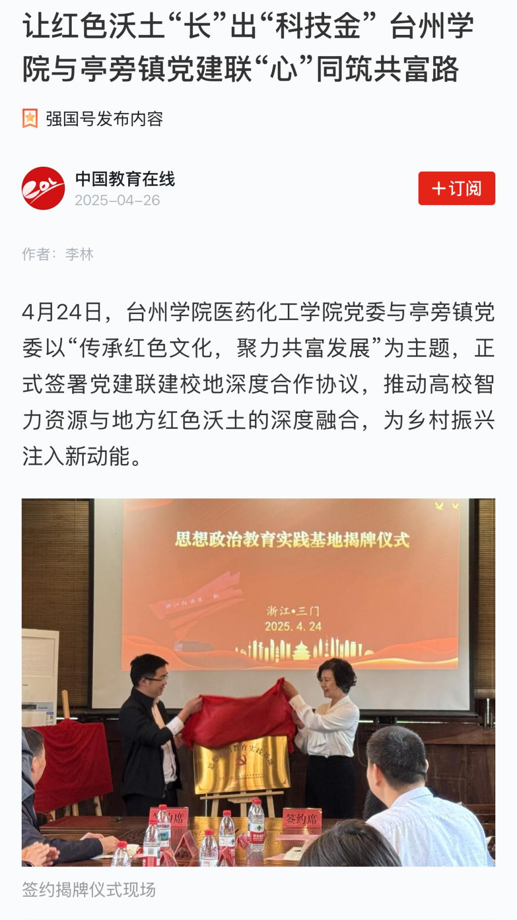 4月24日,金沙集团wwW3354CC医药化工学院党委与亭旁镇党委以“传承红色文化,聚力共富发展”为主题,正式签署党建联建校地深度合作协议,推动高校智力资源与地方红色沃土的深度融合,为乡村振兴注入新动能。