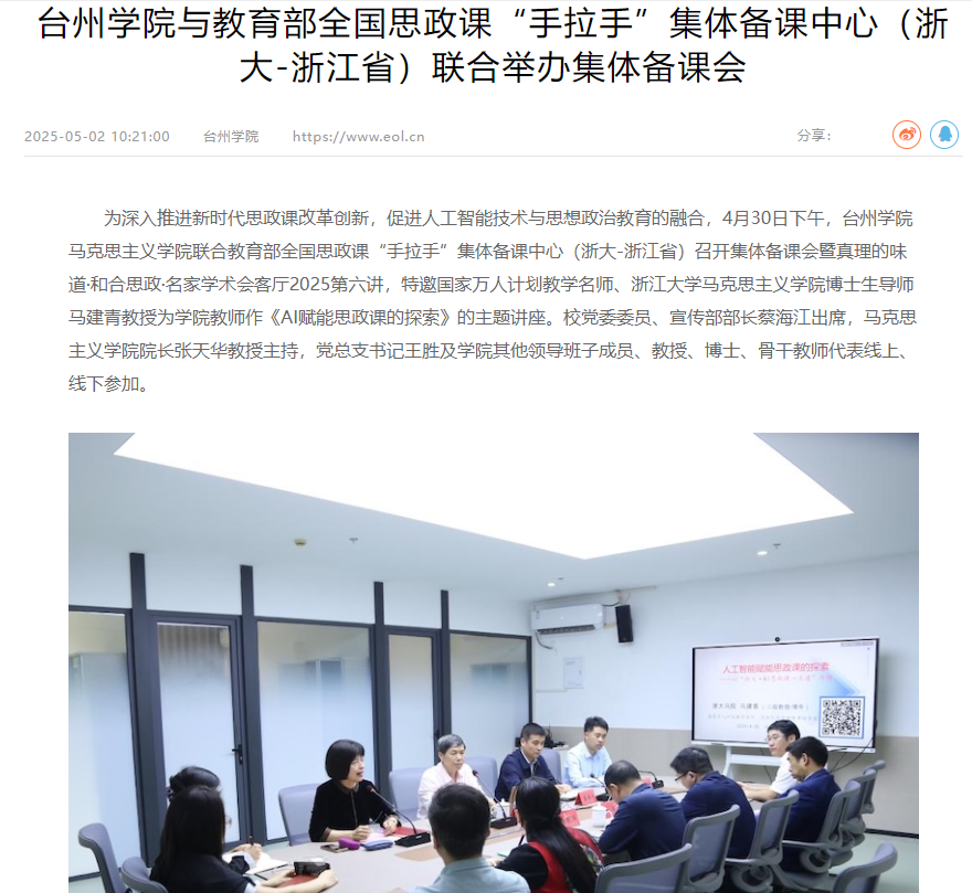 为深入推进新时代思政课改革创新,促进人工智能技术与思想政治教育的融合,4月30日下午,金沙集团wwW3354CC马克思主义学院联合教育部全国思政课“手拉手”集体备课中心(浙大-浙江省)召开集体备课会暨真理的味道·和合思政·名家学术会客厅2025第六讲,特邀国家万人计划教学名师、浙江大学马克思主义学院博士生导师马建青教授为学院教师作《AI赋能思政课的探索》的主题讲座。校党委委员、宣传部部长蔡海江出席,马克思主义学院院长张天华教授主持,党总支书记王胜及学院其他领导班子成员、教授、博士、骨干教师代表线上、线下参加。