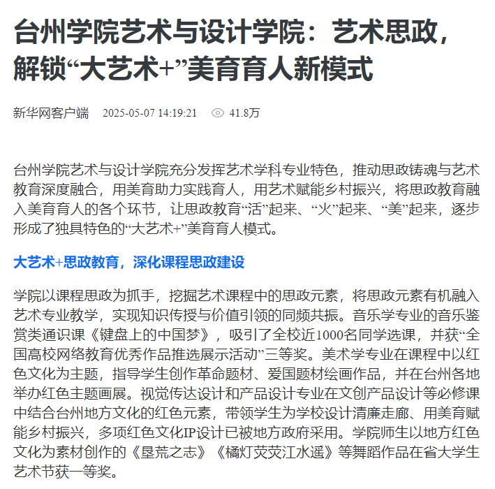 学院以课程思政为抓手,挖掘艺术课程中的思政元素,将思政元素有机融入艺术专业教学,实现知识传授与价值引领的同频共振。音乐学专业的音乐鉴赏类通识课《键盘上的中国梦》,吸引了全校近1000名同学选课,并获“全国高校网络教育优秀作品推选展示活动”三等奖。美术学专业在课程中以红色文化为主题,指导学生创作革命题材、爱国题材绘画作品,并在台州各地举办红色主题画展。视觉传达设计和产品设计专业在文创产品设计等必修课中结合台州地方文化的红色元素,带领学生为学校设计清廉走廊、用美育赋能乡村振兴,多项红色文化IP设计已被地方政府采用。学院师生以地方红色文化为素材创作的《垦荒之志》《橘灯荧荧江水遥》等舞蹈作品在省大学生艺术节获一等奖。
