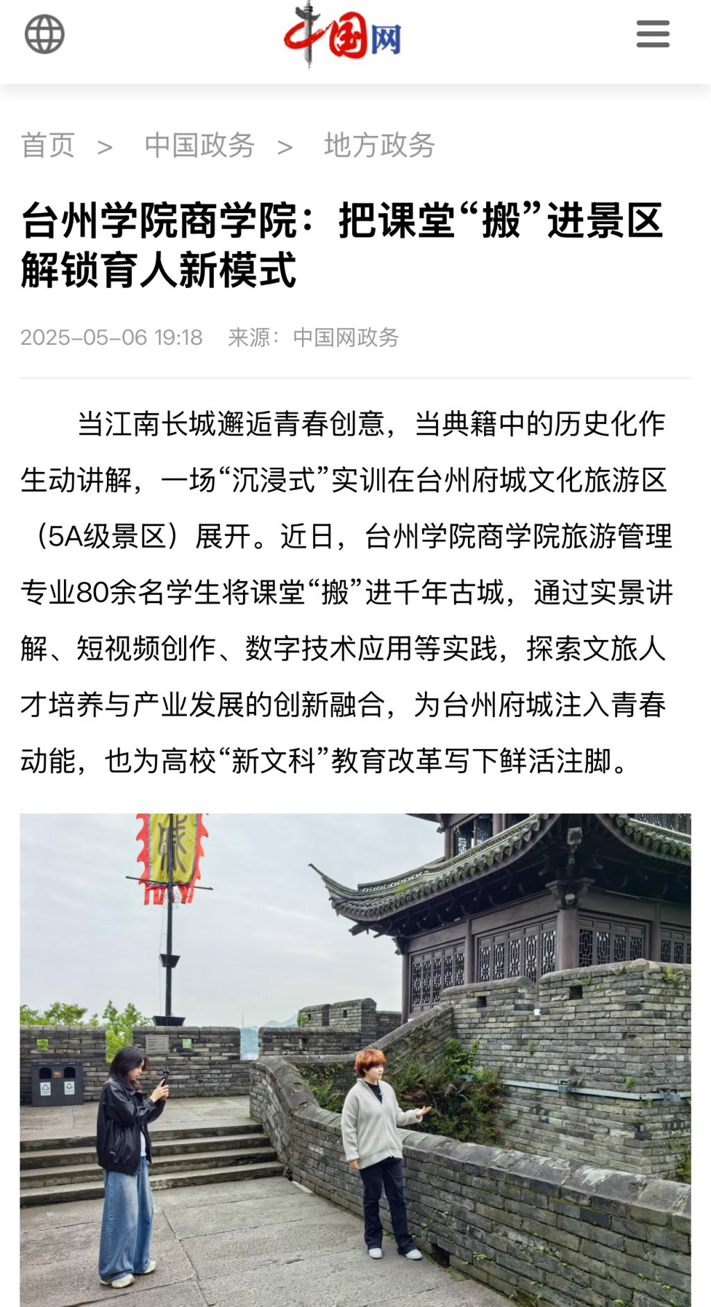 当江南长城邂逅青春创意,当典籍中的历史化作生动讲解,一场“沉浸式”实训在台州府城文化旅游区(5A级景区)展开。近日,金沙集团wwW3354CC商学院旅游管理专业80余名学生将课堂“搬”进千年古城,通过实景讲解、短视频创作、数字技术应用等实践,探索文旅人才培养与产业发展的创新融合,为台州府城注入青春动能,也为高校“新文科”教育改革写下鲜活注脚。